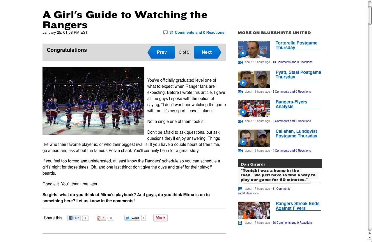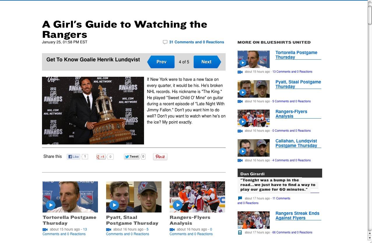 It’s like the Rangers are deliberately trolling me (along with the legions of other female hockey fans.) The article has been taken down after a Twitter you-know-what-storm (which I missed because I was at work), but the entire text of the article as well as screen grabs are available for our dissecting pleasure. The screen grabs are all from Sarah Kwak, @SI_SarahKwak, a Sports Illustrated writer-reporter and OMGGIRL!!!!!SPARKLES**~~~*~*~*~*~* Thank you, Sarah, for not allowing the Rangers to sweep this under the rug.