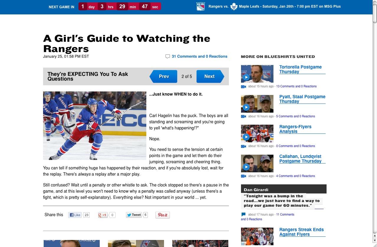 Twitter comrade @rope_terson pointed me in the direction of the New York Rangers’ post today called “A Girl’s Guide to Watching the Rangers.” Good god, do my followers know me well. Even though I am treated by some as though I’m a shrill, shrieking harpy having a heavy flow day whenever I choose to bring up sexism (because women can’t ever be right, we can only be crazy and marginalized), I’m not going to be shut up that easily.