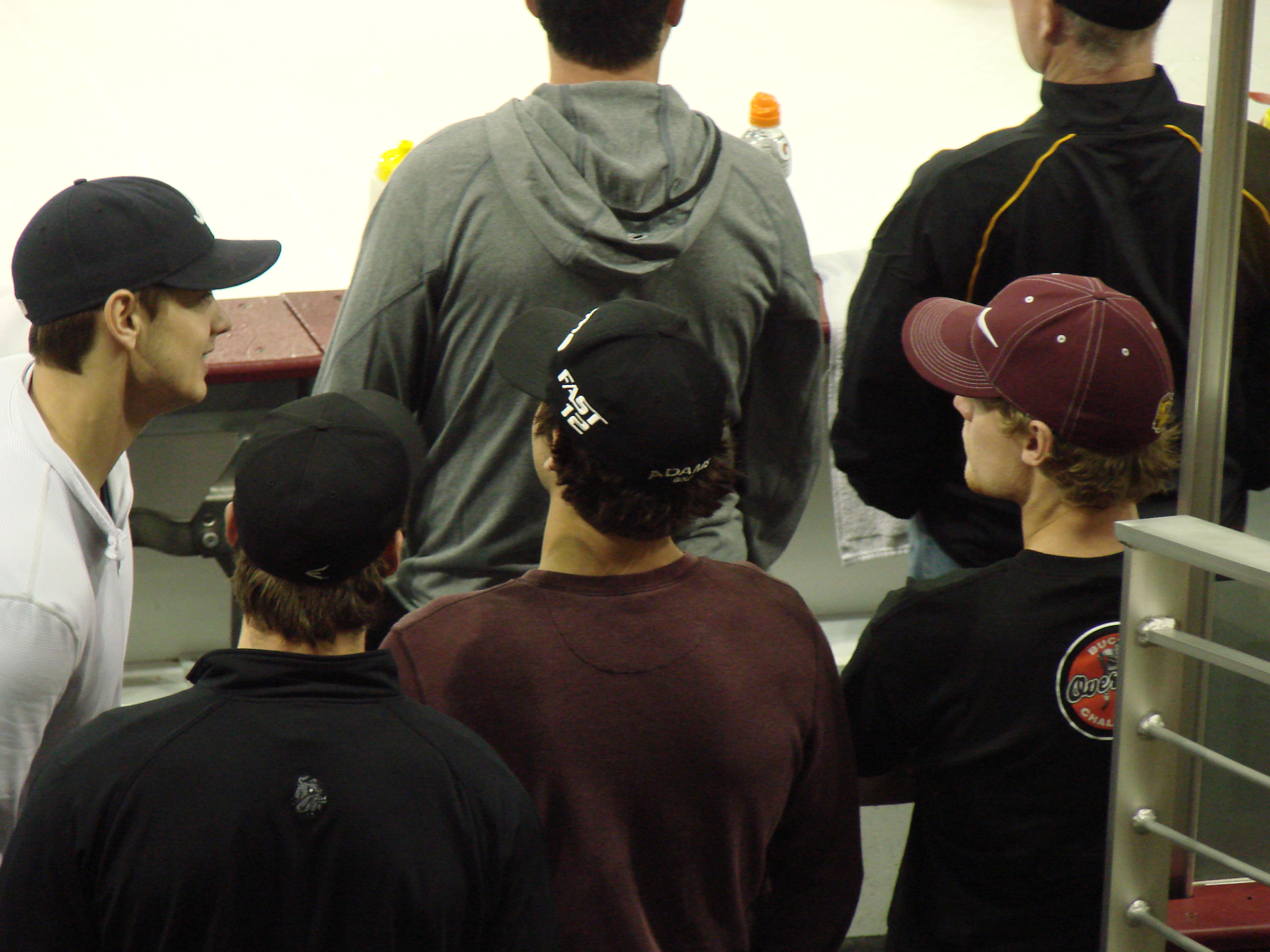 Here’s Fonz with Parise, who Gretchen said is “always smiling.” He isn’t here. Probably because, after his ill-advised comment regarding the 2003-2004 season, he looked up at the rafters and remembered Fonz led his team to a national championship and Zach led his team to… an epic choke job. Or, as Gretchen pointed out, maybe he saw Junior’s Hobey banner.