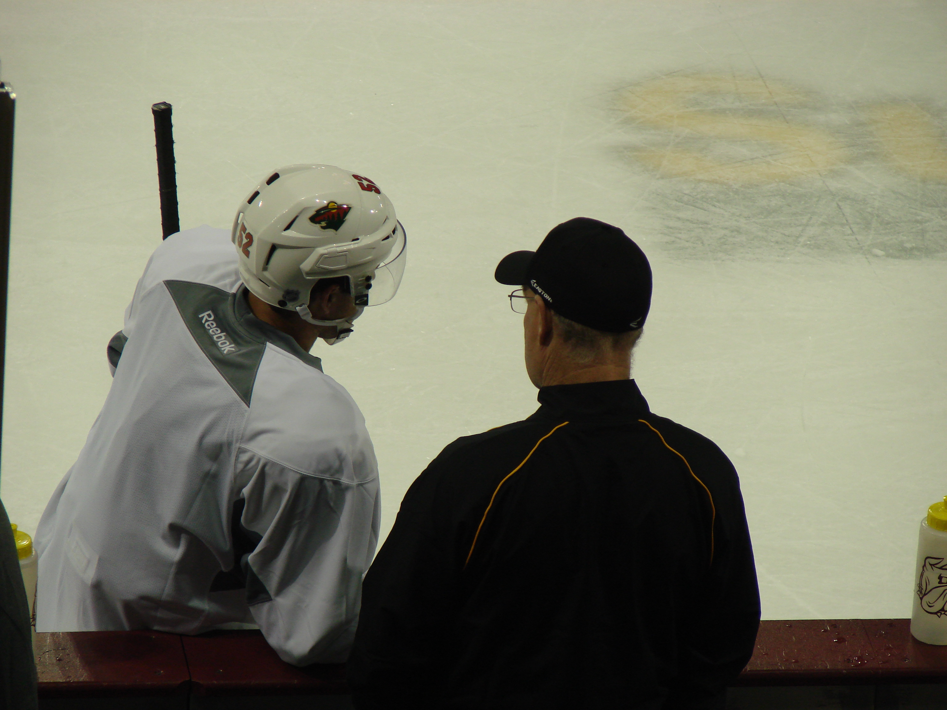 Fonz and Hoagy together again! Awwww. Gretchen told me that Sandy came out and talked to Fonz, too, and Heatley also had a long chat with Sandelin. Most likely discussing Heatley’s last game at the DECC, which we will not discuss. Bruce already traumatized Judd Medak with the memory.