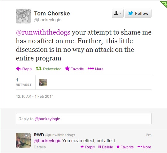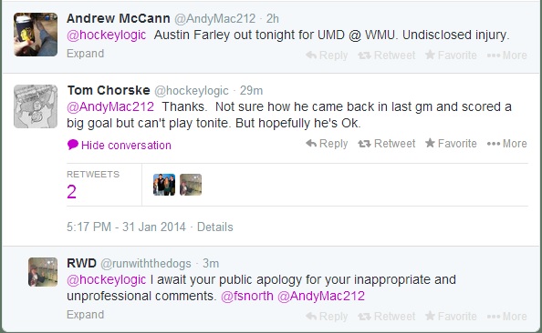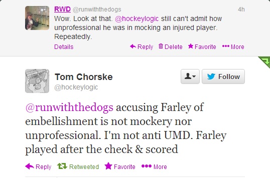 Yesterday I posted a bunch of screen shots from his Twitter account (he styles himself as HockeyLogic, which secretes a rank odor of irony), but there’s more! Since Farley didn’t play tonight (we’ll discuss the game later, pointing out the incompetence of, well, anyone is much more entertaining for me), naturally I thought (as did another like-minded fellow) our dear chairwarmer would like to know, and would like the chance to reach out to Farley and the team and make amends, as a mature, professional adult would.