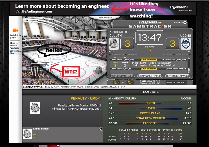 This is not going to be the best gamer ever, because I wasn’t able to watch or listen to the game. The video feed cost lots of moneys, and there was no radio feed. I eventually figured out there was a live stats thingy. It was already 3-0 UConn at that point. Barf barf barf. At the time, I thought Sarah MacDonnell had scored a natural hat trick, but I guess the scoring got corrected and she only had an assist on the second goal. Only, indeed. Kayla Black got the hook for Karissa Grapp after the third goal. Because I was late to finding the stat tracker, I thought Grapp had started the game, oops. I don’t really understand what the heck happened, because Black was back for the second period, but thank you, Karissa, for jumping in and stopping the hemorrhaging.